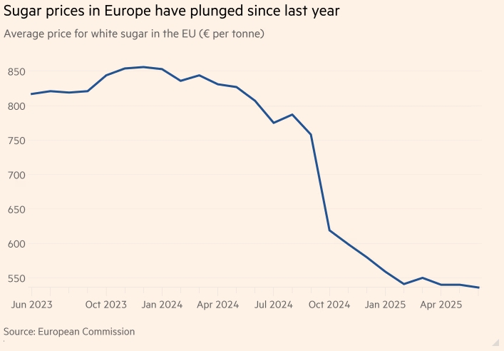 По данным Европейской комиссии, с прошлого лета цены на сахар в Европе упали более чем на треть. В июне они составили 536 евро за тонну. Комиссия по торговле товарными фьючерсами сообщила, что спекулятивные трейдеры открыли крупнейшую с 2019 года короткую позицию по фьючерсам на сахар в Нью-Йорке, что является самой крупной коллективной ставкой на снижение цен за последние годы.