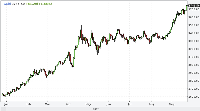 В понедельник, 22 сентября, стоимость золота взлетела до нового исторического максимума $3746,5 за унцию, чему способствовали растущие ожидания дальнейшего снижения процентных ставок в США и сохраняющийся спрос на безопасные активы на фоне политической неопределенности.