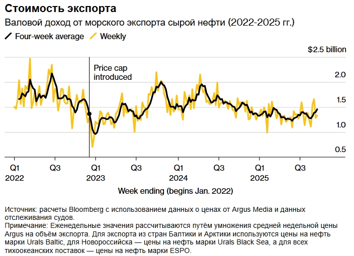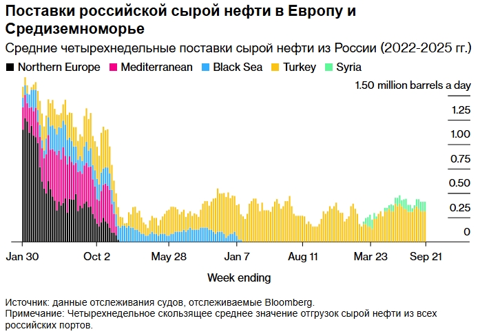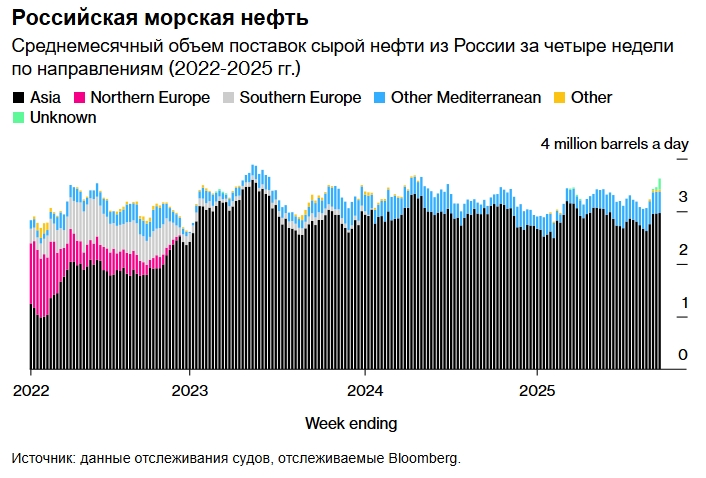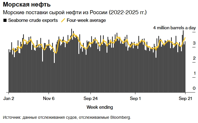 Согласно данным о движении судов, собранным агентством Bloomberg, среднесуточный объём экспортных отгрузок из российских портов за четыре недели достиг рекордных 3,62 млн баррелей. Этот показатель зафиксирован за 28-дневный период, завершившийся 21 сентября, и является самым высоким с мая 2024 года. Среднее значение позволяет более точно оценить основные тенденции, чем менее стабильные недельные показатели.