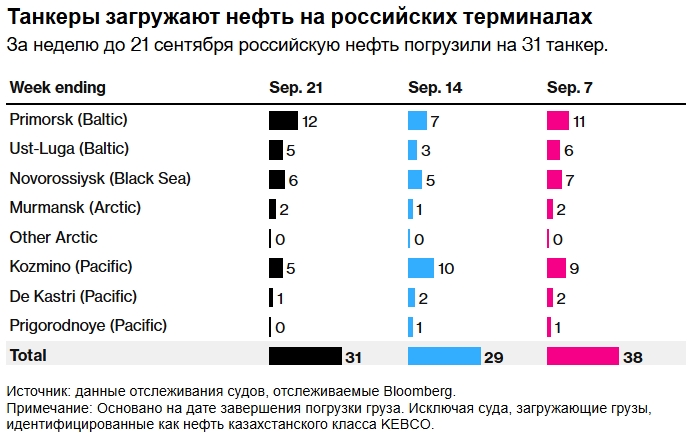 Согласно данным о движении судов и отчётам портовых агентов, за неделю, закончившуюся 21 сентября, было загружено 31 танкер с 23,69 млн баррелей российской нефти. Это превышает 22,26 млн баррелей, перевезённых 29 судами на предыдущей неделе.