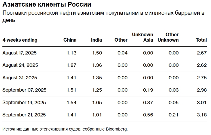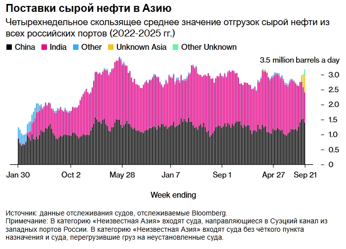 Поставки российской нефти азиатским потребителям, включая нефть без конечного пункта назначения, выросли до 3,18 млн баррелей в сутки за 28 дней по 21 сентября, по сравнению с пересмотренным показателем в 3,01 млн баррелей в сутки на 14 сентября. Поток сырой нефти в азиатские страны является самым высоким за более чем шесть месяцев.