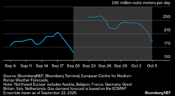 Спрос на природный газ в жилом и коммерческом секторах Северо-Западной Европы вырастет примерно на четверть на этой и следующей неделях. Таков обновленный энергетический прогноз Bloomberg на ближайшие 14 дней, основанный на метеорологических ожиданиях.