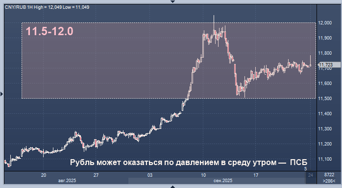Национальная валюта может оказаться под давлением ухудшения ожиданий по геополитике в начале торговой сессии в среду, в результате чего китайская валюта предпримет попытку перехода в верхнюю половину диапазона 11,5-12 рублей за юань, прогнозирует управляющий по анализу банковского и финансового рынков банка ПСБ Богдан Зварич.