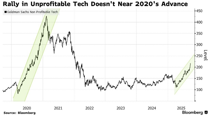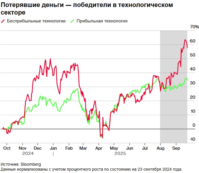 С конца июля корзина убыточных технологических компаний UBS выросла на 21%, в то время как прибыльные технологи компании увеличились всего на 2,1%, а индекс Nasdaq 100 поднялся на 5,9%. Это привело к тому, что менее известные компании, такие как SoundHound AI Inc. и Unity Software Inc., достигли максимальных значений с конца 2021 года, когда низкие процентные ставки способствовали росту спекулятивных активов, но этот пузырь лопнул в следующем году.