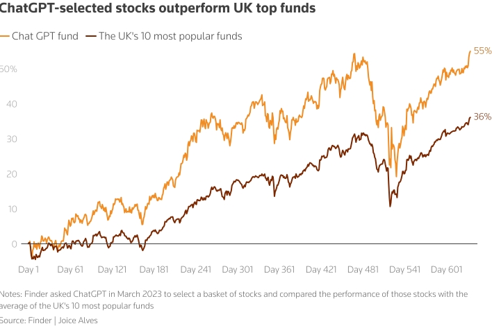 Акции, выбранные ChatGPT, превосходят ведущие фонды Великобритании. Фонд GPT и 10 самых популярных фондов Великобритании. Примечание: В марте 2023 года Finder попросил ChatGPT выбрать корзину акций и сравнил доходность этих акций со средним показателем 10 самых популярных фондов Великобритании. Источник: Finder | Джойс Алвес