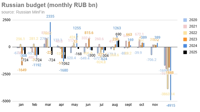 В августе был зафиксирован небольшой профицит бюджета в размере 430 млрд руб., что компенсировало дефицит июля в размере 686 млрд руб., однако совокупный дефицит за полугодие значительно превышает показатель последних двух лет (1П25: 3,69 трлн руб. или 1,7%).
