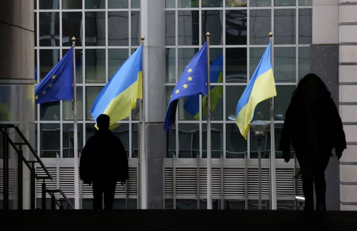 Флаги Украины развеваются перед зданием Европарламента в первую годовщину российского вторжения в Брюссель, Бельгия, 24 февраля 2023 г. REUTERS/Yves Herman/Архивное фото. Приобретение лицензионных прав, открывается новая вкладка