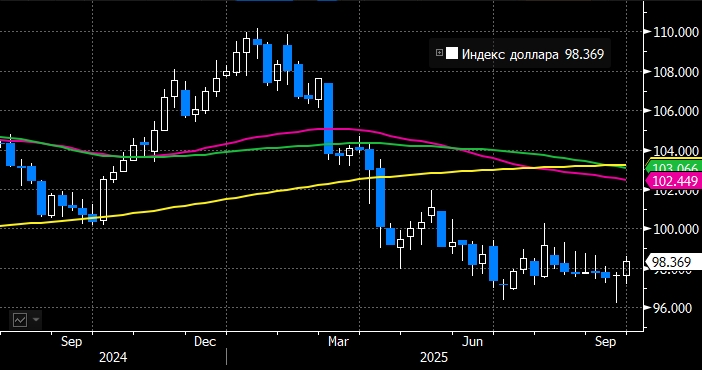 Доллар с начала недели уверенно укрепился против всех валют стран «Большой десятки». Индекс доллара 5 недель подряд пытался закрепиться выше уровня 98 пунктов. Но удалось это сделать только на 6-й неделе. Техническая картина по индексу доллара предполагает, что на фоне неспособность летом уйти ниже отметки 96 пунктов, теперь DXY может, как минимум проверить на прочность психологическое сопротивление 100 пунктов. Это подразумевает рост на 1,7% от текущих значений. Полная реализация фигуры «двойное дно» предполагает, что до конца текущего года DXY может протестировать значение в 102 пункта. А это уже +4% к текущим значениям. Такой сценарий не выглядит благоприятным для рынков акций.