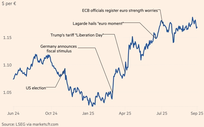 В этом году евро укрепился более чем на 12% по отношению к доллару США. Это произошло на фоне возобновившегося оптимизма по поводу роста еврозоны и опасений по поводу программы президента США Дональда Трампа, что, по словам главы Европейского центрального банка Кристин Лагард, привело к «глобальному моменту евро». В этом месяце евро достиг четырёхлетнего максимума, превысив $1,19.