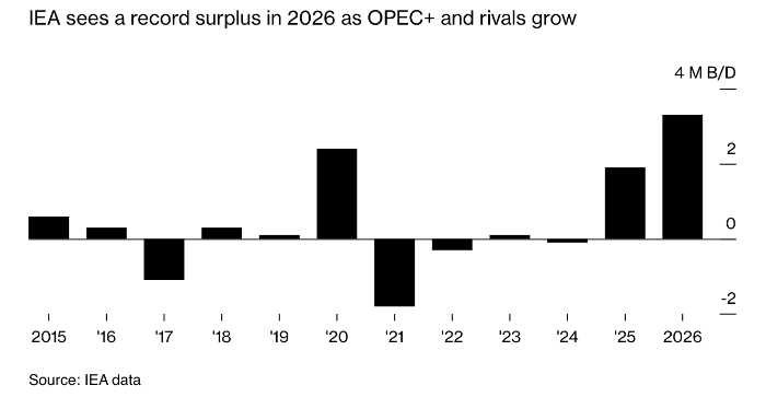 Международное энергетическое агентство (МЭА) прогнозирует рекордный избыток предложения в 2026 году, поскольку ОПЕК+ продолжает восстанавливать добычу, а поставки от конкурентов группы растут. Goldman Sachs Group Inc. ожидает падения цен на Brent до середины диапазона $50 за баррель в следующем году, несмотря на накопление запасов сырой нефти в Китае.