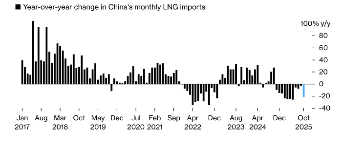 Поставки СПГ в Китай в годовом соотношении падают одиннадцатый месяц подярд. Источник: Bloomberg