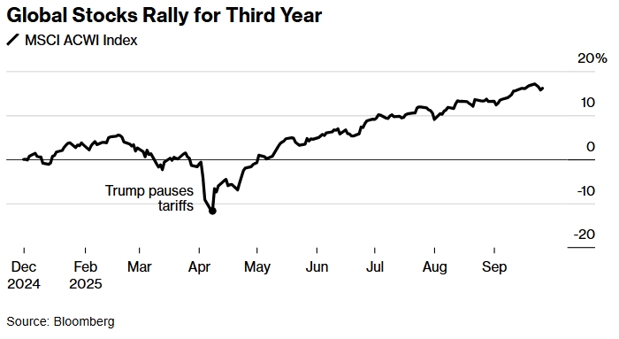Мировые акции растут третий год подряд. Источник: Bloomberg