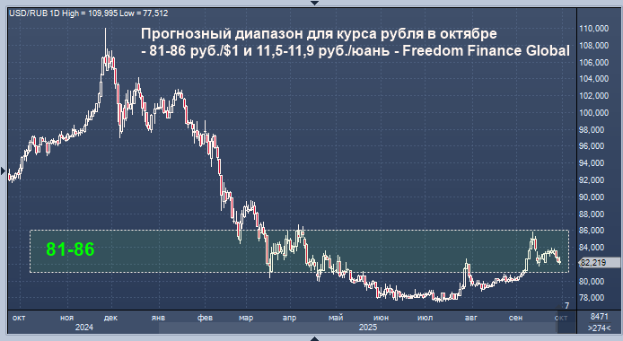 Прогнозный диапазон для курса рубля в октябре составляет 81-86 руб./$1 и 11,5-11,9 руб./юань, говорится в комментарии ведущего аналитика Freedom Finance Global Натальи Мильчаковой.