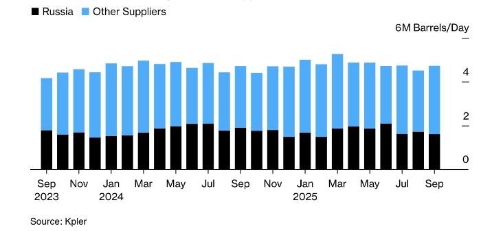 По данным аналитической компании Kpler, в сентябре поставки в третью по величине страну-потребитель составили 1,61 млн баррелей в сутки, что ниже августовского показателя в 1,72 млн. По сравнению с прошлым годом, российские потоки сократились на 16% — что соответствует диапазону, о котором в августе сообщали источники, знакомые с ситуацией.
