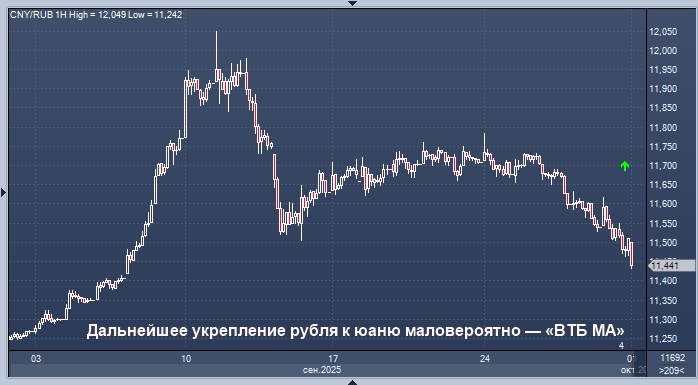 Дальнейшее укрепление рубля по отношению к юаню маловероятно, пара CNY/RUB, скорее всего, вернется в диапазон 11,5-12 рублей за юань, полагают аналитики телеграм-канала "ВТБ Моя Аналитика".
