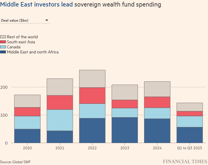 Инвесторы из Ближнего Востока лидируют в расходах суверенных фондов благосостояния. Стоимость сделки (млрд долл. США). Остальной мир. Юго-Восточная Азия. Канада. Ближний Восток и Северная Африка. Источник: Глобальный SWF. FT