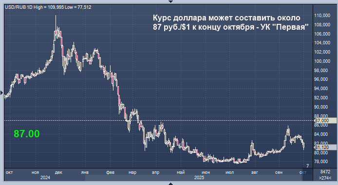 Курс доллара может составить около 87 руб./$1 к концу октября, прогнозирует аналитик УК "Первая" Максим Федосов. По мнению эксперта, в октябре умеренное ослабление рубля, вероятнее всего, продолжится. Курс доллара в среднем может составить 85 руб./$1, к концу месяца - около 87 руб./$1.