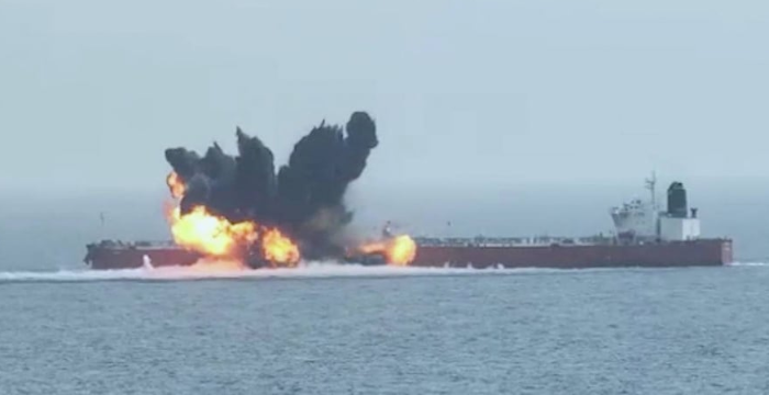 Нападение беспилотных морских дронов на танкер Chios Lion в Красном море 15 июля 2024 года. (Ansarullah media centre / AFP)