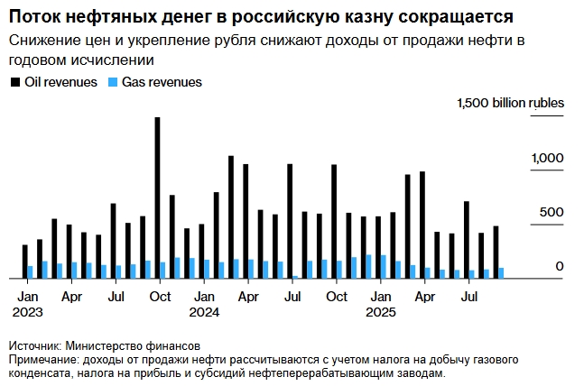 Выручка упала из-за снижения мировых цен на нефть из-за опасений о возможном избытке на глобальном рынке. ОПЕК+, в которую входит Россия, ускорила восстановление добычи, что вызвало опасения о превышении предложения над спросом в следующем году. Президент США Дональд Трамп призвал покупателей отказаться от закупок нефти у Москвы, что может нанести ущерб российскому бюджету.