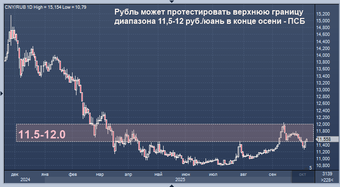 "По нашим оценкам, с фундаментальной точки зрения актуальным для юаня продолжает оставаться диапазон 11,5-12 рублей. В краткосрочной перспективе (вероятно, после завершения выходных в Китае) ожидаем возвращения стоимости китайской валюты в рамки данного коридора. К концу осени ждем попыток тестирования его верхней границы", - пишет аналитик в комментарии.