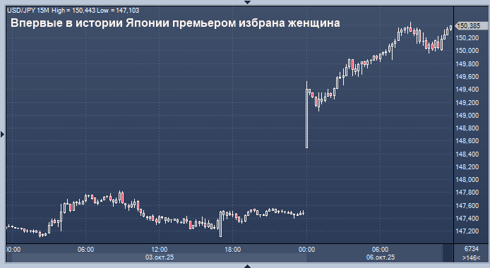 В понедельник на валютных рынках доминировали политические события. Японская иена ослабла по отношению к доллару сильнее всего за последние пять месяцев. Санаэ Такаичи готовилась занять пост премьер-министра Японии после победы на выборах лидера правящей Либерально-демократической партии. Евро также упал на фоне новостей о том, что новый премьер-министр Франции Себастьен Лекорню уходит в отставку.