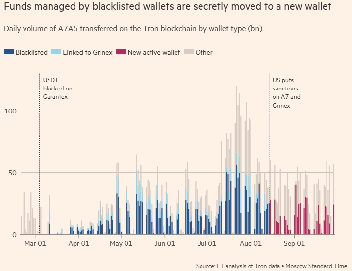 Согласно анализу FT, начиная со следующего дня после августовского решения, администраторы A7A5 удалили содержимое двух кошельков, связанных с Grinex, в которых находилось в общей сложности 33,8 млрд токенов на сумму 405 млн долларов. Это составляет более 80 % от общего количества A7A5 в обращении.