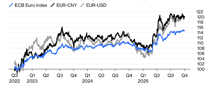 Это имеет болезненный побочный эффект в виде усиления тарифного давления, которое делает экспорт из еврозоны менее конкурентоспособным. Еще более катастрофическим кажется падение китайского юаня на 16,4% по отношению к европейской валюте за последние три года, что дает Пекину возможность поддерживать работу своего экспортного двигателя за счет Европы. Торговая война проигрывается на обоих фронтах.