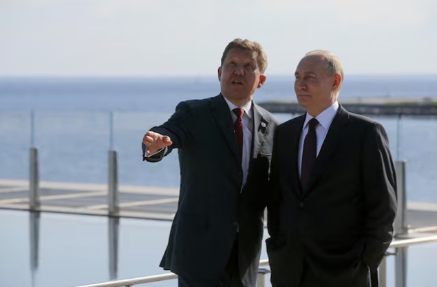 Президент России Владимир Путин беседует с генеральным директором «Газпрома» Алексеем Миллером во время посещения бизнес-центра «Лахта» в Санкт-Петербурге, Россия, 5 июня 2024 года. Sputnik/Константин Завражин/Pool через REUTERS.