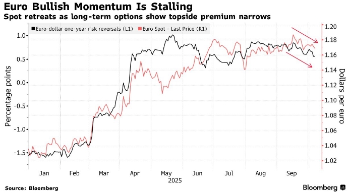 Валюта торгуется ниже $1,17 и готовится к очередному падению подряд. В понедельник она достигла минимума более чем за неделю после внезапной отставки премьер-министра Франции Себастьена Лекорню, что обострило политический кризис в стране. Показатель направления опционов, который часто отслеживают, изменился с бычьего на медвежий, сигнализируя о готовности трейдеров к дальнейшим убыткам.
