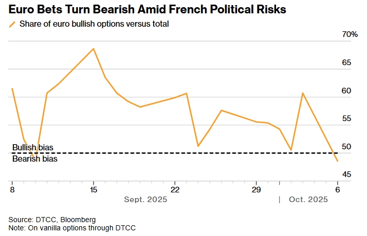 Это контрастирует с предыдущей волной политических рисков во Франции. 8 сентября после поражения Франсуа Байру в вотуме недоверия евро остался стабильным: валюта выросла примерно на 0,4% за день, а опционные позиции стали оптимистичными с соотношением активов около 60 к 40 в пользу роста, как показывают данные DTCC.