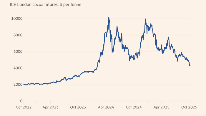 На этой неделе фьючерсы на какао в Нью-Йорке торговались около $6 150 за тонну, потеряв почти 50% от пиковых значений выше $12 000. Лондонские контракты, в свою очередь, упали примерно на 58% от своего апрельского пика.