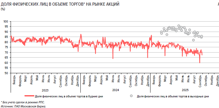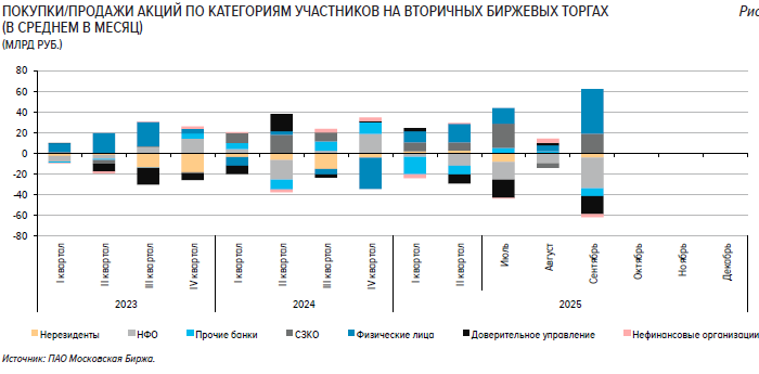 «На вторичных биржевых торгах акциями крупнейшими нетто-покупателями были розничные инвесторы (они приобрели акций на 43,1 млрд руб. — максимальный месячный объем с 2022 г.), при этом крупнейшие продажи совершили НФО в рамках доверительного управления и управления собственными средствами — суммарно на 47,4 млрд рублей», — сообщает Банк России в «Обзоре рисков финансовых рынков». — «…Средняя доля физических лиц в торгах в сентябре составила 69,6%, в то время как в среднем за последний год — 75,8%».