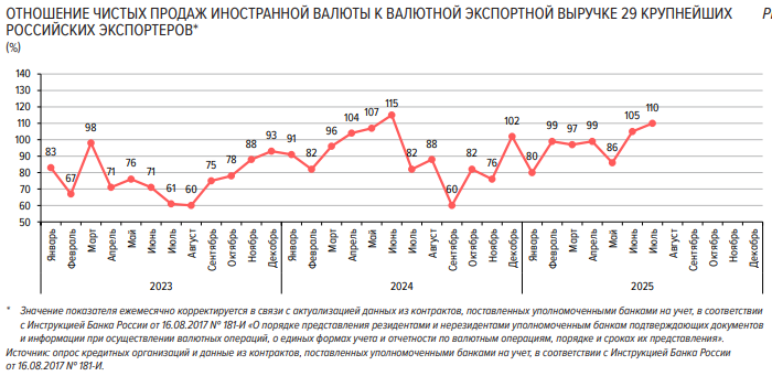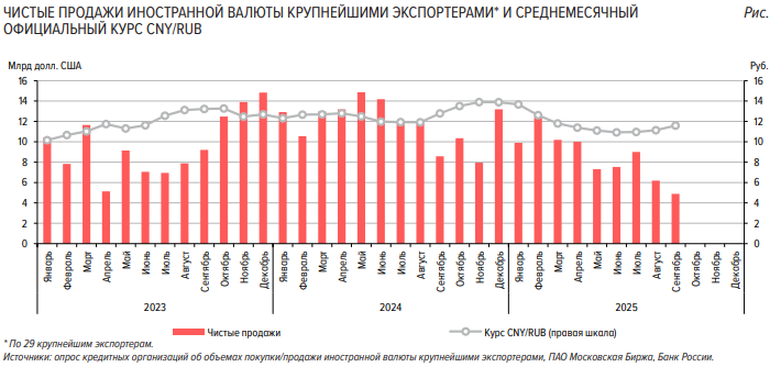 «Рост спроса на валюту со стороны юридических лиц (без учета банков), наблюдавшийся в предыдущие месяцы, приостановился в сентябре, снизившись на 5% относительно предыдущего месяца», — отмечает регулятор. — «…часть крупных экспортеров продолжила накапливать иностранную валюту с целью погашения обязательств перед банками. Среднедневные чистые продажи также сократились (на 25% м/м) и составили 222 млн долл. США».