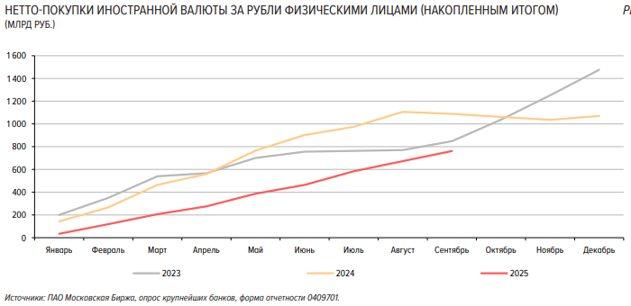 В сентябре физлица купили иностранной валюты на чистые 88,9 млрд руб., что почти полностью соответствует цифрам августа. С начала года данный показатель составляет 762 млрд руб., что в 1,4 раза ниже аналогичных цифр прошлого года (1089 млрд руб.).