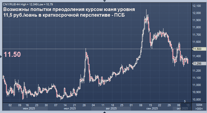 Возможны попытки преодоления курсом юаня уровня 11,5 руб./юань в краткосрочной перспективе, считает управляющий эксперт Центра аналитики и экспертизы банка ПСБ Денис Попов.