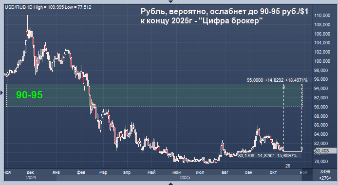 "Цифра брокер" ожидает умеренное ослабление рубля по отношению к доллару США до конца текущего года, до 90-95 руб./$1, сообщается в стратегии аналитиков инвестиционной компании на четвертый квартал 2025 года. Основные причины - рост спроса на валюту со стороны импортеров и сокращение предложения от экспортеров.