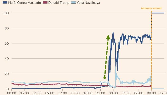 Ставки на претендентов на Нобелевскую премию мира на платформе Polymarket в день официального объявления победителя. Источник: Financial Times
