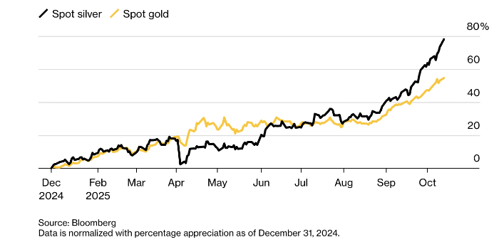 К середине октября дефицит предложения подбросил цены на серебро в Лондоне примерно на 70% с начала года — против 55% у золота. Оба металла пользуются повышенным спросом как средства сохранения стоимости в периоды политических потрясений, инфляции и девальвации валют.