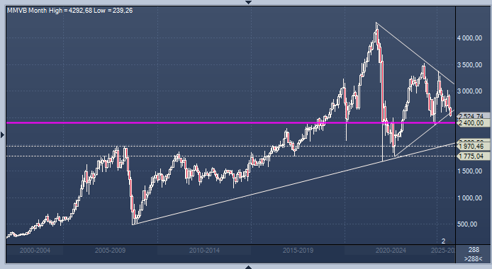 "Картина по рынку в целом выглядит нерадостной, при отсутствии позитивных новостей или начале ослабления рубля вероятность падения индекса Мосбиржи в район 2400 пунктов, к минимумам декабря прошлого года, велика", - пишет Антонов в материале инвесткомпании.