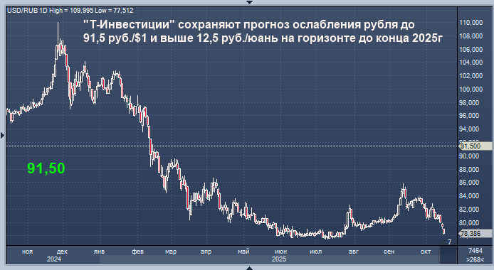 "Т-Инвестиции" сохраняют прогноз на ослабление курсов пар доллар/рубль и юань/рубль до 91,5 руб./$1 и выше 12,5 руб./юань соответственно на горизонте до конца текущего года, сообщается в комментарии главного экономиста брокера Софьи Донец.