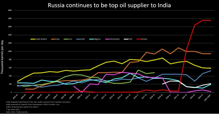По данным правительства, за период с апреля по сентябрь, то есть за первые 6 месяцев финансового года, Индия импортировала 1,75 миллиона баррелей российской сырой нефти в день, при этом ее доля снизилась примерно до 36% от общего объема импорта нефти в Индию с 40% за тот же период годом ранее.