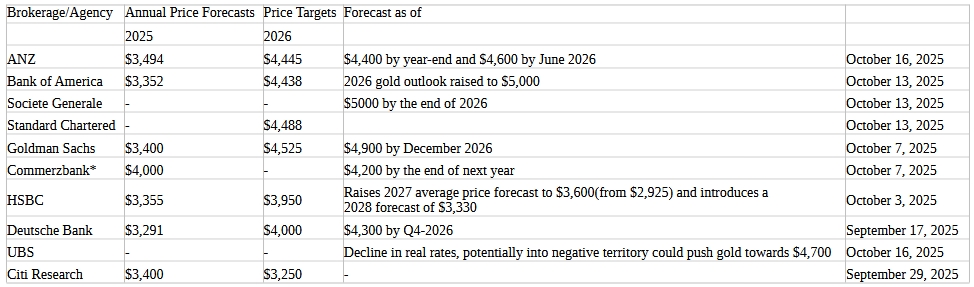 Вот список последних прогнозов аналитиков на 2025 и 2026 годы (в долларах за унцию):