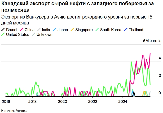По данным отслеживания судов Vortexa, с начала октября из Ванкувера было отправлено почти 5 миллионов баррелей нефти, что является рекордом за первые 15 дней любого месяца. Китайские покупатели активно закупают более полумиллиона баррелей иностранной сырой нефти в день, чтобы воспользоваться значительными скидками на российскую и иранскую нефть. Это происходит на фоне усиливающегося давления США, направленного на экономическое сдерживание этих стран.