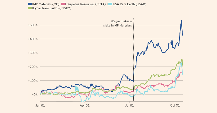 Эти шаги вызвали ажиотаж на фондовом рынке. Акции американских MP Materials, USA Rare Earth и австралийской Lynas с начала года выросли более чем в два раза. Ралли перекинулось и на производителей других металлов, таких как литий и кобальт. После объявления об инвестициях со стороны правительства США акции Lithium Americas удвоились, а Trilogy Metals — утроились за несколько часов.
