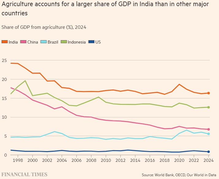 Сельское хозяйство составляет большую долю ВВП в Индии, чем в других крупных странах. Доля сельского хозяйства в ВВП (%), 2024 г. Индия, Китай, Бразилия, Индонезия, США. FT. Источник: Всемирный банк, ОЭСР, Наш мир в данных