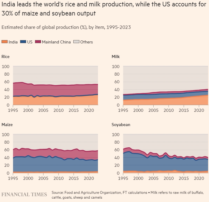 Индия занимает лидирующее место в мире по производству риса и молока, а на долю США приходится 30% производства кукурузы и сои. Расчетная доля мирового производства (%), по товарам, 1995-2023 гг. Индия, США, материковый Китай, другие. Рис, молоко. FT. Источник: Продовольственная и сельскохозяйственная организация, расчёты Financial Times. Под молоком понимается сырое молоко буйволов, крупного рогатого скота, коз, овец и верблюдов.
