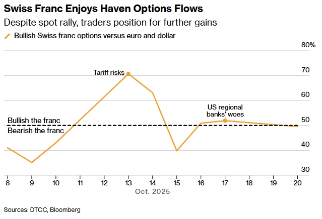Расходы на хеджирование достигли максимального уровня с середины августа, а премия за владение франком через опционы вернулась к значениям мая, поскольку трейдеры ищут защиту и направляют свои риски.