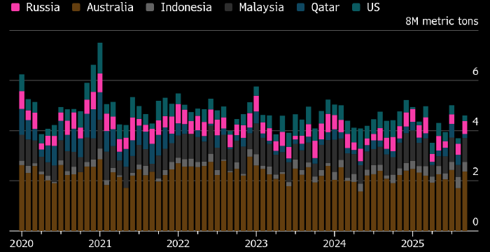Структура импорта СПГ Японией (млн метрических тонн в месяц). Источник: Bloomberg