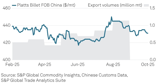 Несмотря на предложение Китайской ассоциации производителей чугуна и стали, выдвинутое в конце июня, ограничить экспорт заготовки в ответ на значительные объемы китайского экспорта в начале 2025 года, экспорт резко вырос в июле и августе.