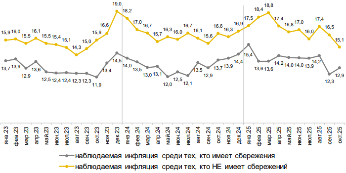 В октябре инфляционные ожидания россиян остались на уровне 12,6% (самый низкий показатель с сентября 2024 года). Одновременно с этим наблюдаемая инфляция снизилась до 14,1% (минимальное значение с мая 2024 года).